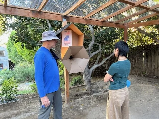 Gabrielle Jennings, Lost Birds Project: clockwise from top left: 1. Lost Birds (listening station), 2025, cardboard, riso posters, tape, speaker,mp3 player, Elmer's glue, black oil sunflowerseeds, wood, metal, battery powered lights, 43" x 35" x 22" Photo credit: Josh Schaedel | 2. Riso Print (detail) | 3. Lost Birds (listening station) installation view, shown in One Night at the Crystal Palace (Olivia Booth), December 6, 2025. | 4. Lost Birds Series: Jamaican Pauraque, Siphonorhis americana, last seen 1860, 2024, ink and acrylic on digital print on matte paper, 6” x 11”